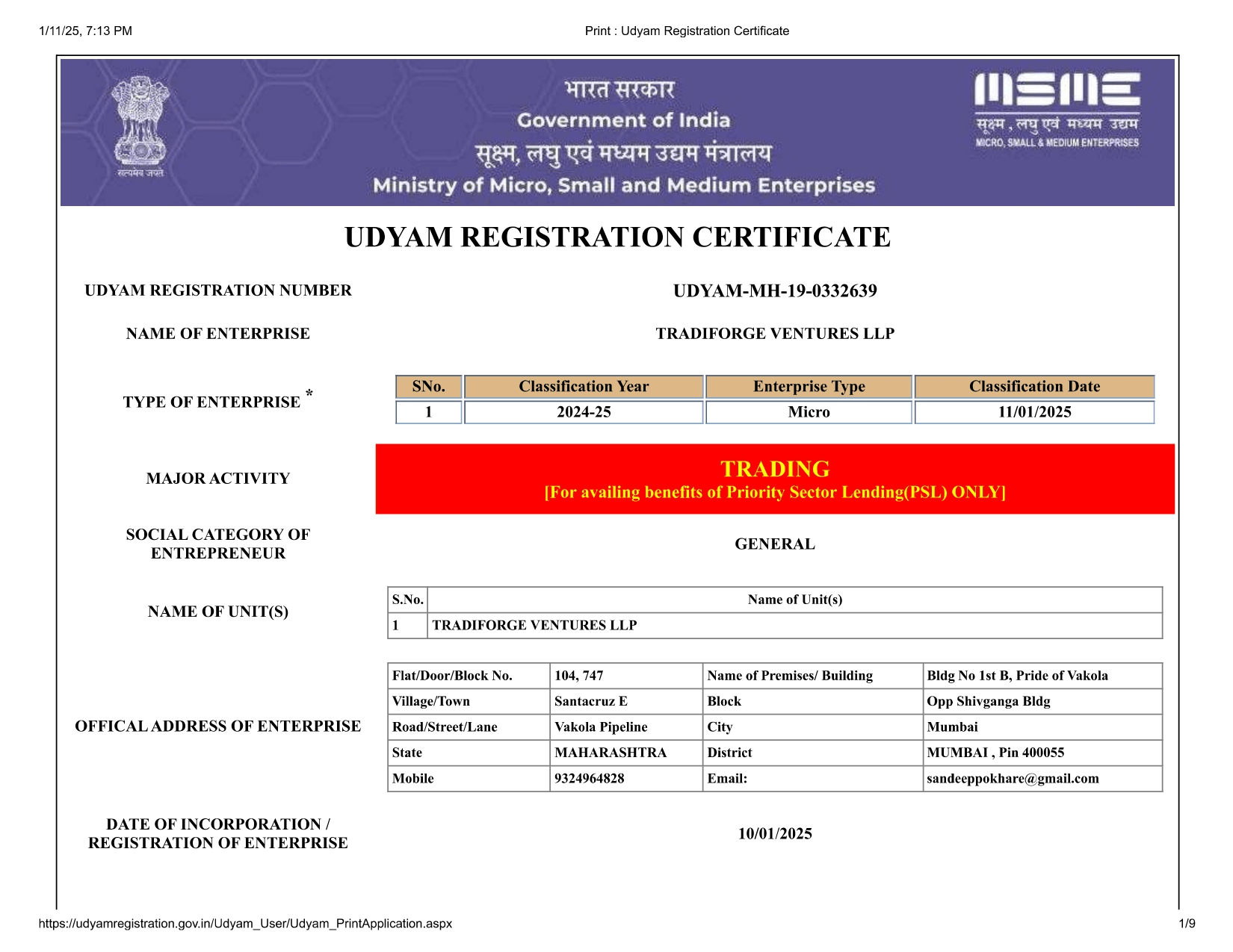 MSME Udyam Registration Certificate