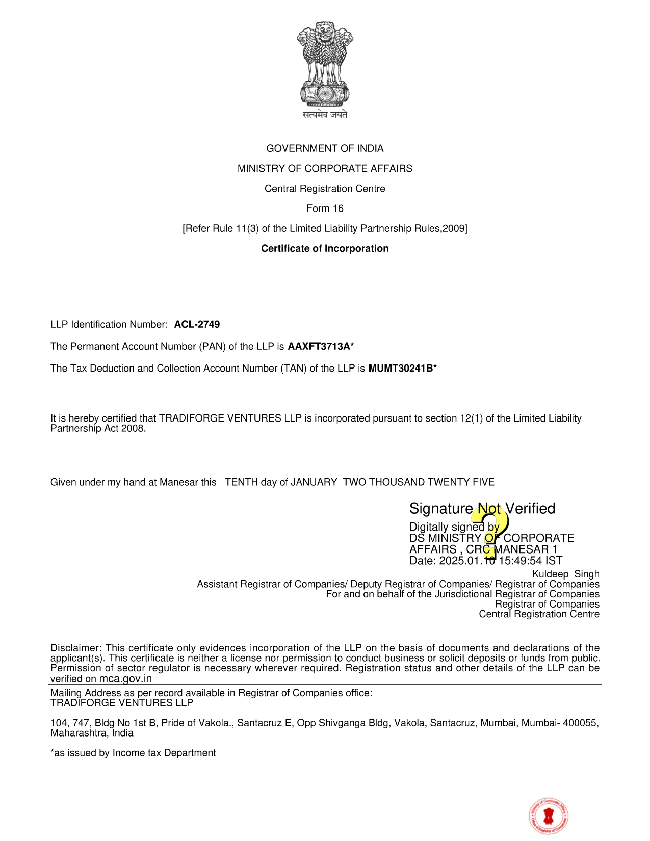 Company Incorporation Certificate