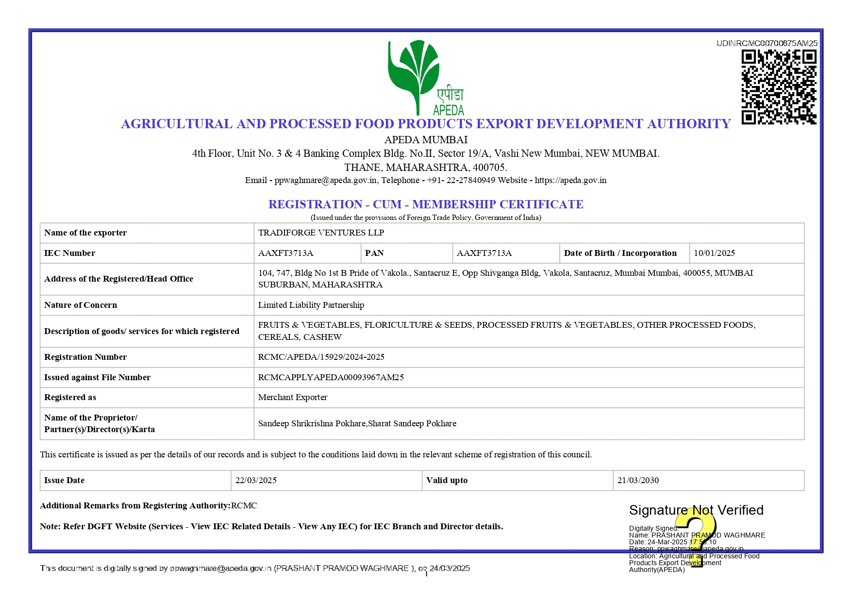 Apeda Certificate
